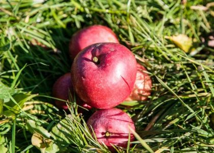 Lepa slika: jablana s preprogo polnih, a črvivih ali razpokanih plodov pod njo. Mnogi ljudje